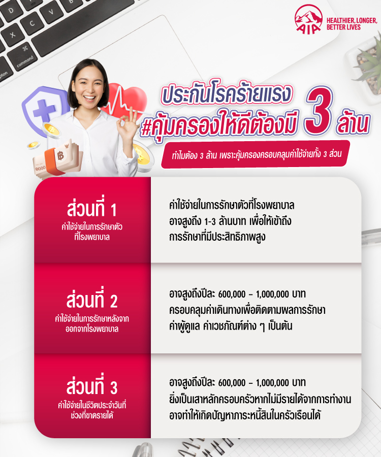 จะเห็นได้ว่าเหตุผลที่ควรมีเงินเอาประกันภัยขั้นต่ำ 3 ล้าน จากประกันโรคร้ายแรง เพื่อเป็นแผนรับมือกับความเสี่ยงในอนาคตให้ครอบคลุม และเพียงพอต่อค่าใช้จ่ายในการรักษาตัวที่อาจเกิดขึ้นในอนาคต