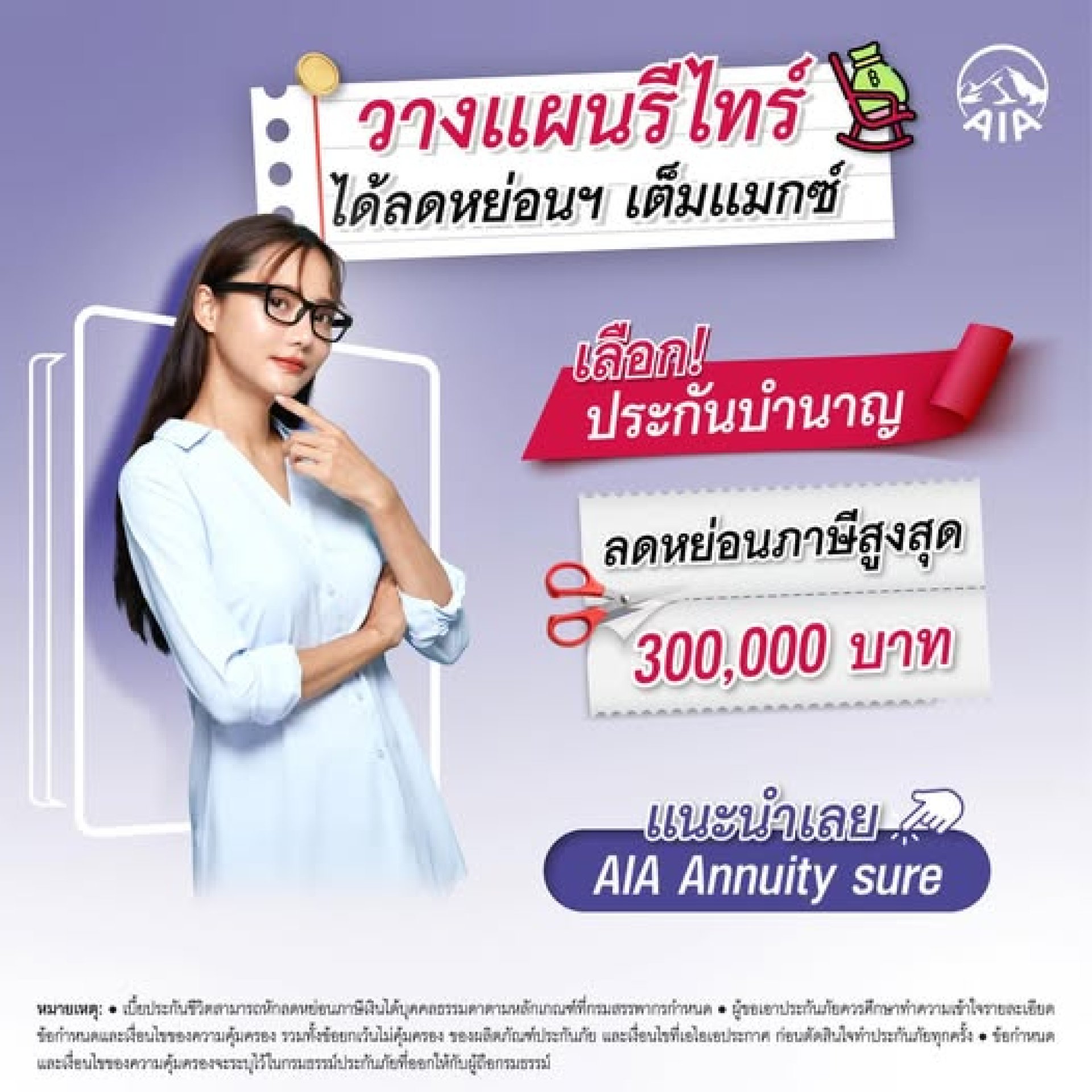 ประกันบำนาญตัวใหม่ที่เราแนะนำ คือ AIA Annuity Sure นอกจากช่วยลดหย่อนภาษีได้แล้ว ยังสร้างความมั่นคงหลังเกษียณให้คุณมีบำนาญรองรับอย่างมั่นใจ