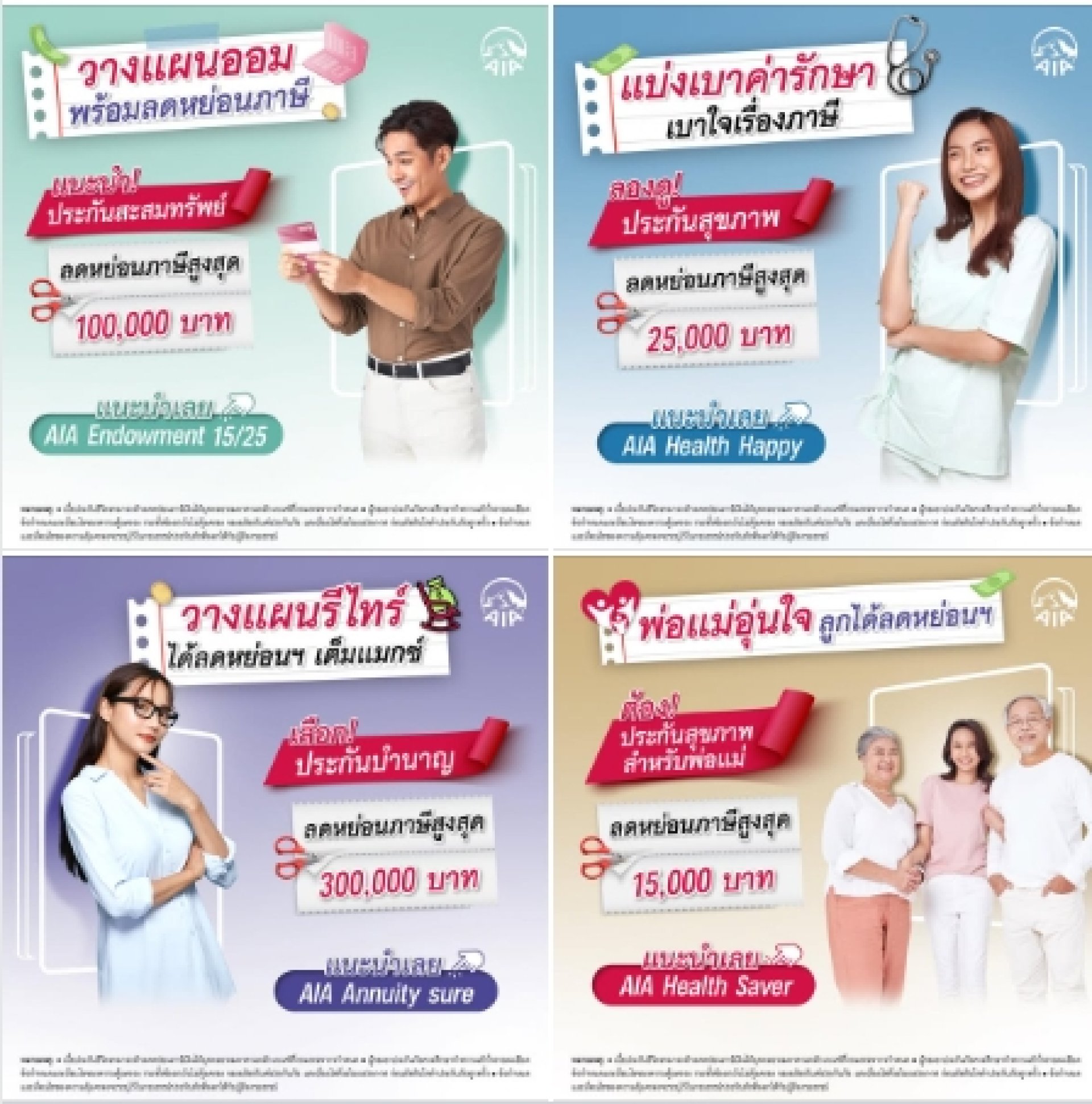 ใกล้ปลายปีแล้ว อย่าลืมเตรียมตัวลดหย่อนภาษีกัน! ทำประกันกับ AIA ปีนี้ ได้ทั้งความคุ้มครองและสิทธิ์ลดหย่อนภาษี บอกเลยว่าคุ้มสุดๆ! มาดูตัวเลือกกันเลย: