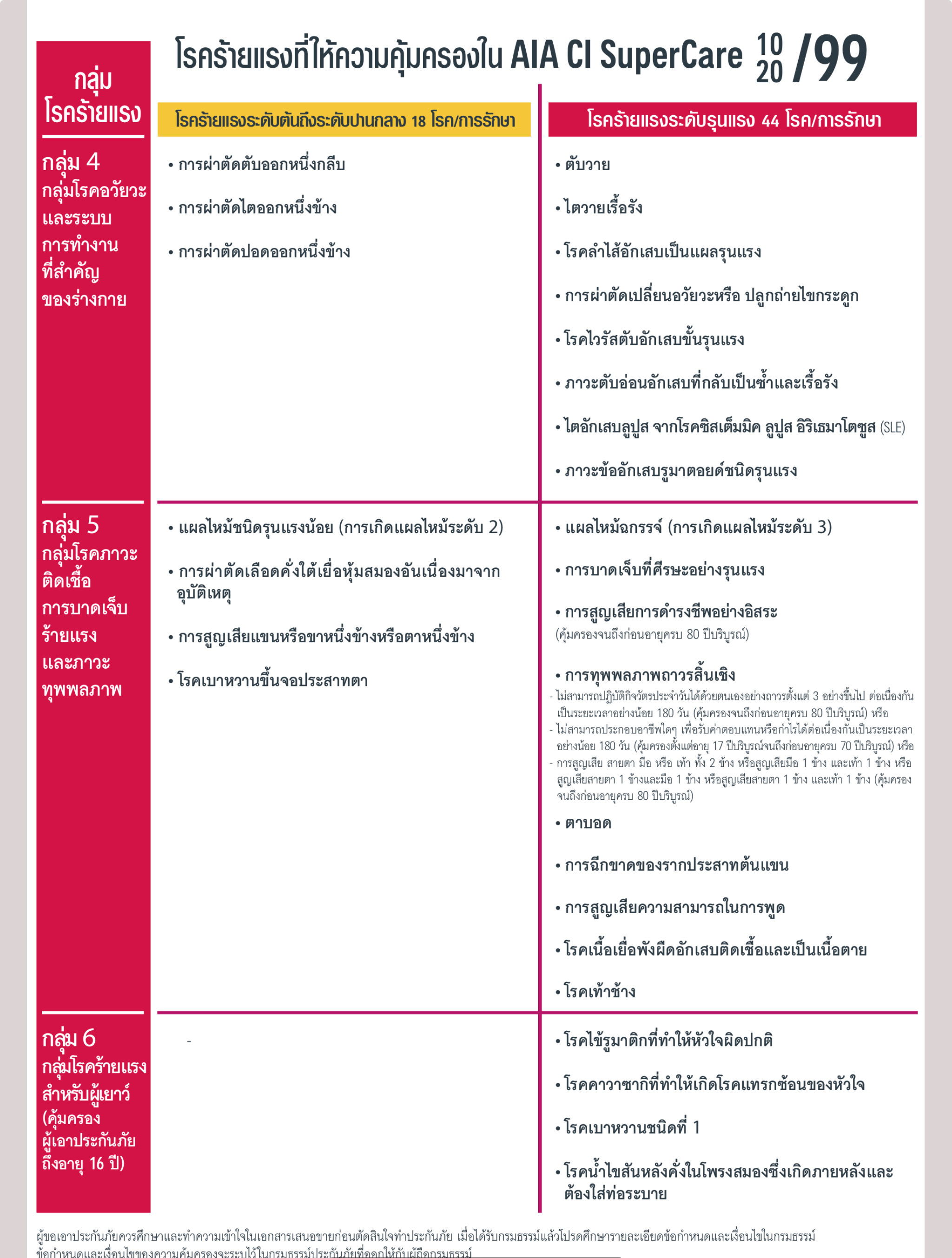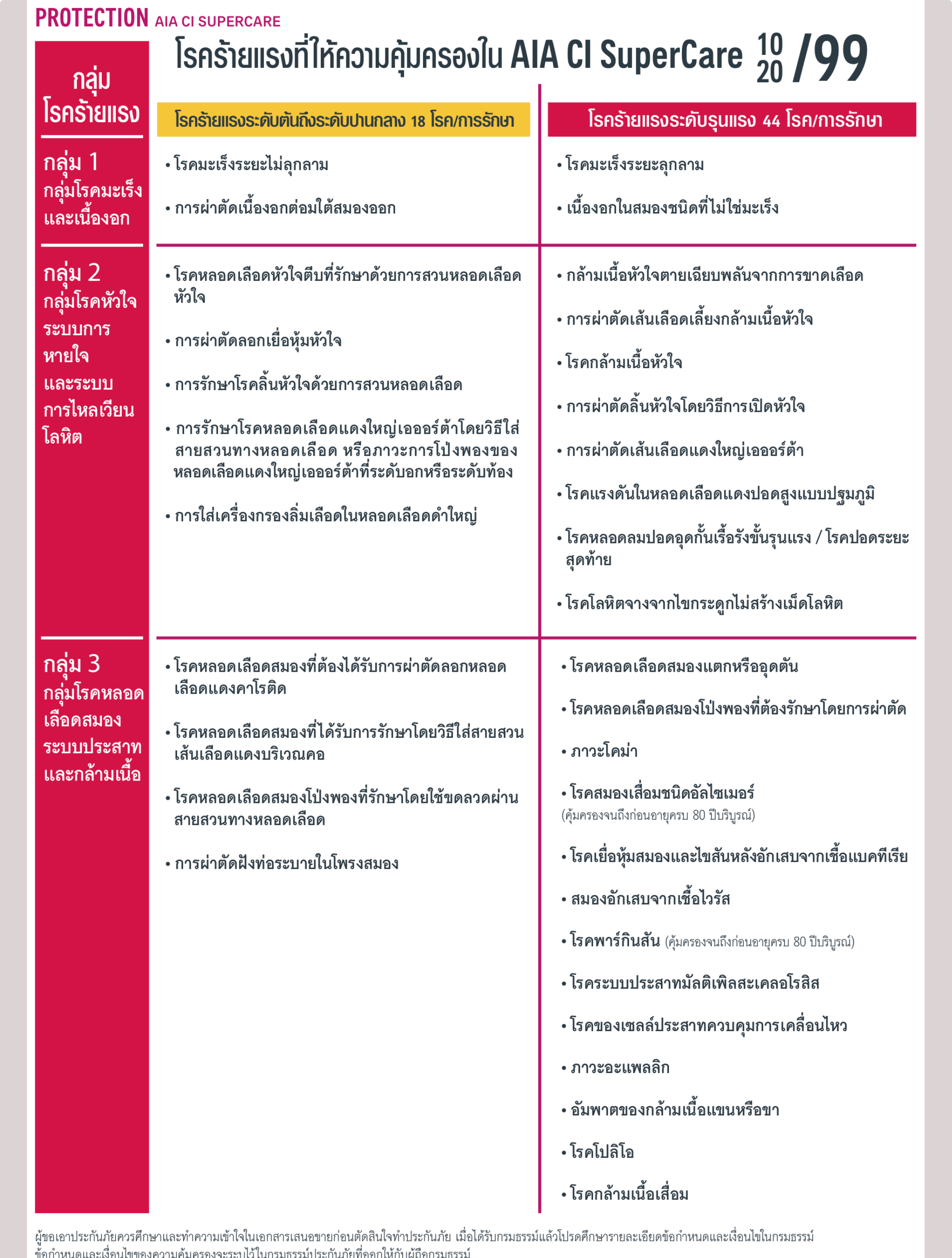 คุ้มครองโรคร้ายแรง 6 กลุ่มโรค โดยแบ่งเป็น คุ้มครองโรคร้ายแแรงระดับต้นถึงปานกลาง 18 โรค และ ระดับรุนแรง 44 โรค ตามภาพ
